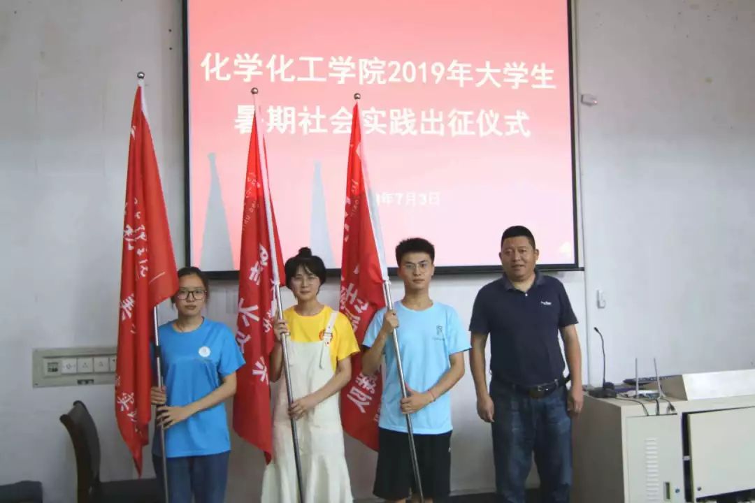 2019�7�3日上�10�30,化学化工学�2019年暑期社会实践出征仪式在志廉�136会议室顺利举行。出席本次活动的有学院党委副书记徐青老师、正科级专职组织员俞兰芳老师、学生科副科长章江燕老师以及三支暑假社会实践队的全体成员,仪式由学院辅导员韩超峰老师主持�